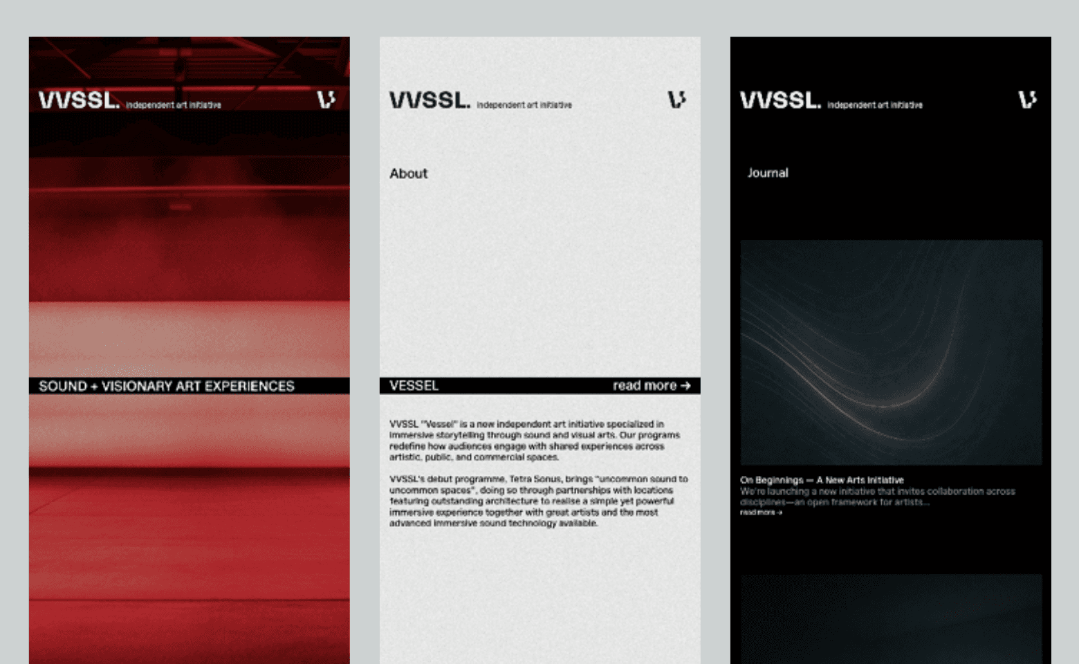 VVSSL (”Vessel”) is a Berlin-based initiative exploring immersive storytelling through sound and visual art. Working in close collaboration with Studio Torsten Posselt, we developed a digital presence that could introduce the initiative with clarity while capturing the atmosphere of their work. Following from STP’s designs, we shaped a website that presented VVSSL’s identity, framed their mission, and supported the launch of their deep-listening event, Tetra Sonus, held in Berlin’s Feuerle Collection. The site needed to feel calm, precise, and quietly expressive - a space where visitors could understand the project and seamlessly secure tickets.